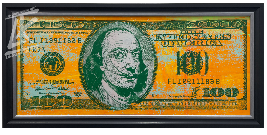 It taps into the cultural nostalgia for a time that predates the internet. Just as society changes and evolves, our currencies—financial, cultural and social—have also changed, reflecting our ever-accelerating technological progress, for better or worse. The hundred dollar bill was redesigned in 2013 to include additional security features (a 3-D Security Ribbon, “color-shifting” ink, etc.), but Kuhn’s depiction harkens back to its previous iteration (when it was just a piece of paper and not a token of the rising surveillance state).