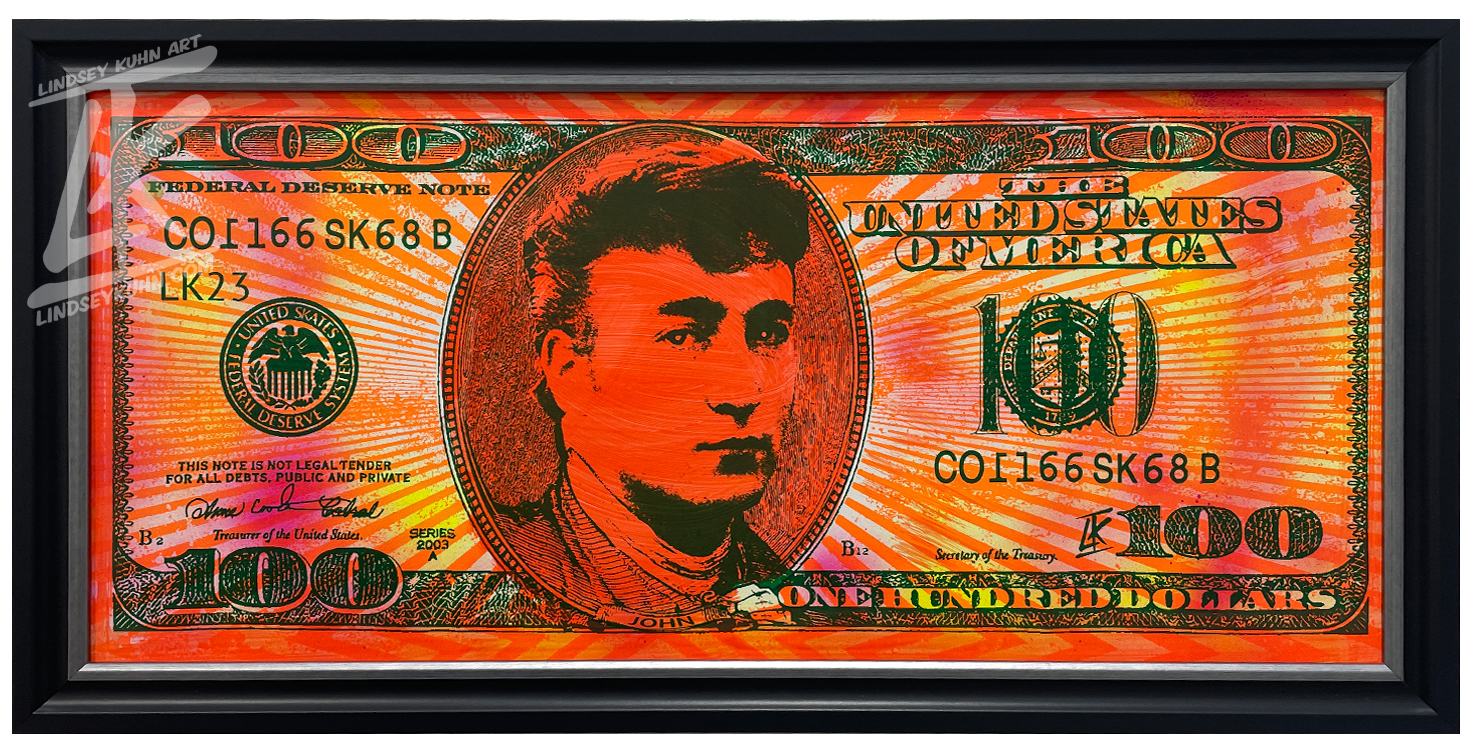 Like the cultural icons depicted in these artworks, Kuhn portrays the bill itself as a kind of historical relic — a testament to our changing values, both literally and figuratively. With Kuhn’s signature blend of satire and sarcasm, "100 Bucks" pays irreverent homage to our society’s driving forces: money and celebrity.